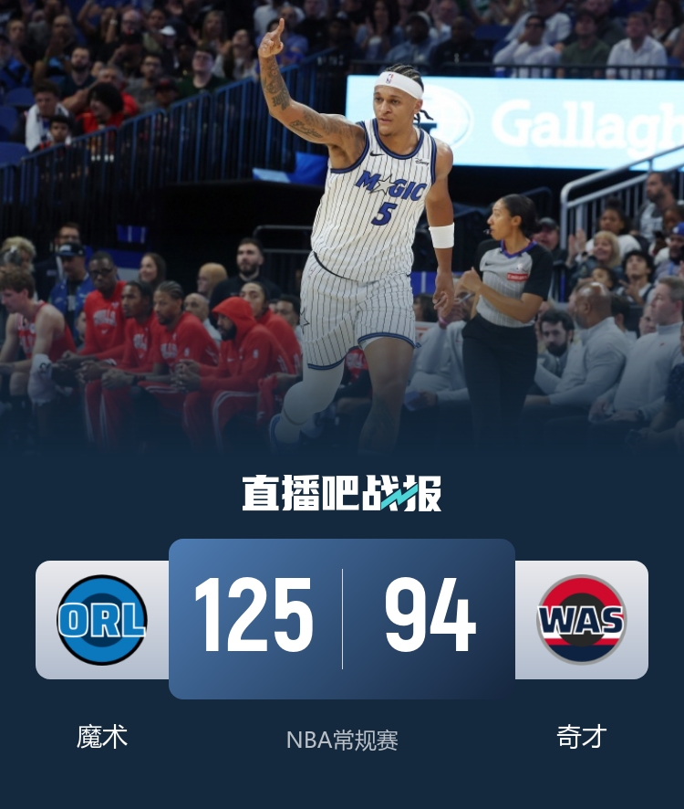 魔术(3-4):班凯罗28分11板4助2帽、小瓦格纳25分6板6助3断、卡特16分12板2帽、比塔泽15分6板3帽、艾萨克8分6板、布莱克8分2板5助、萨格斯6分2板5助5断、琼斯6分2板1助、贝恩5分5助2断、庞达3分2板3助、霍华德3分1板2助、席尔瓦2分2板1助、理查德森1板